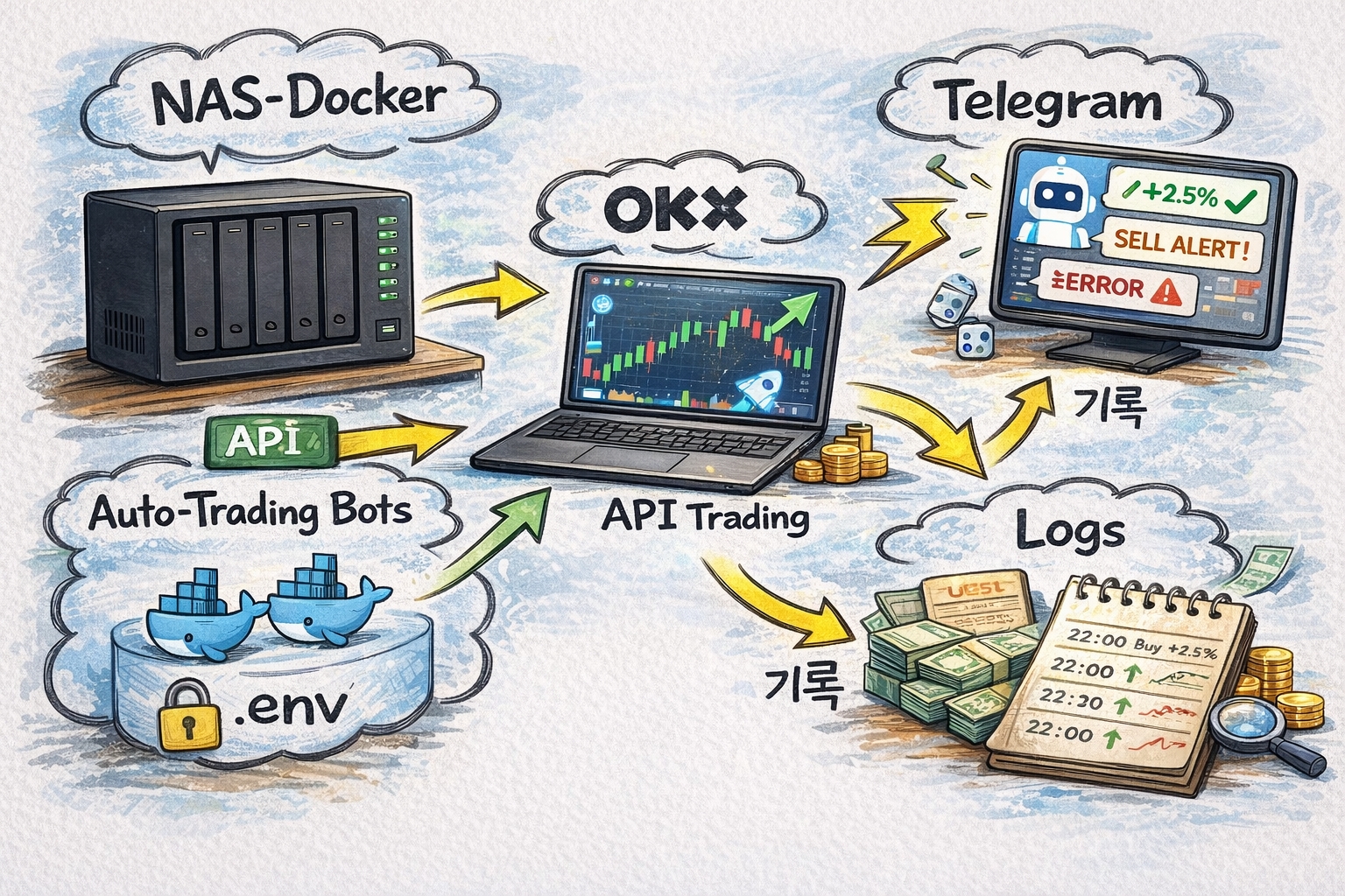 - 초반엔 욕심을 버리고 4가지만 잡았다: NAS(Docker) / OKX / 텔레그램 / 로그.