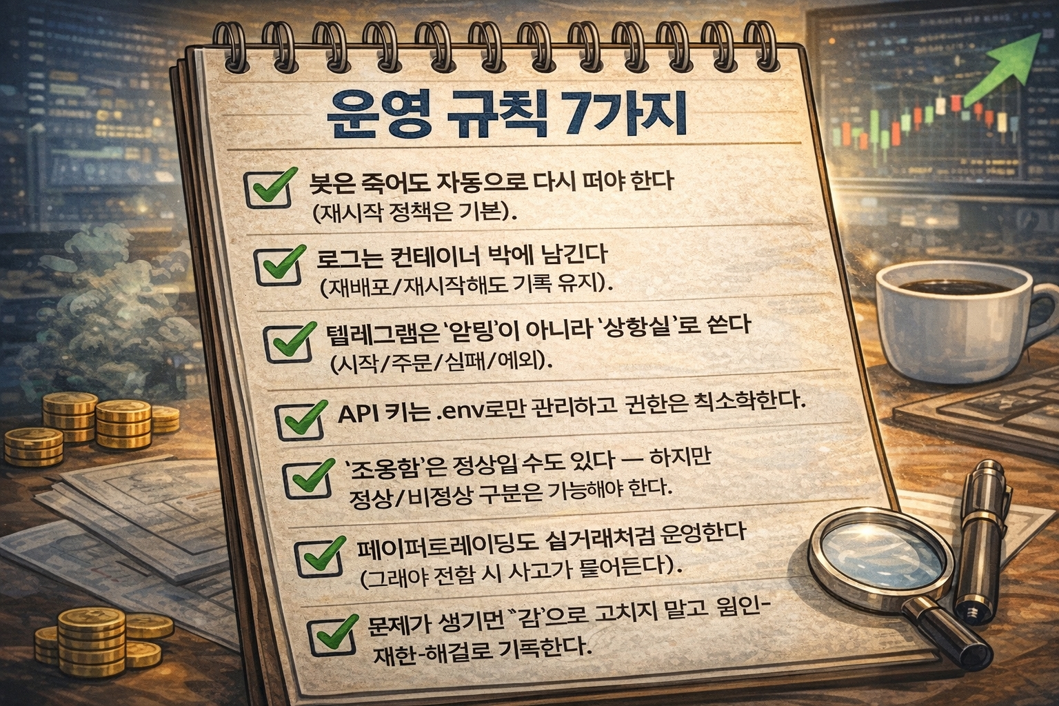 - 텔레그램은 ‘알림’이 아니라 ‘상황실’로 쓴다(시작/주문/실패/예외).